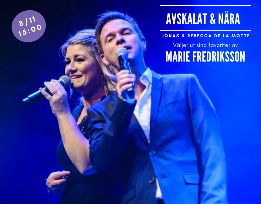 Nu presenterar de ett helt nytt koncept – AVSKALAT & NÄRA – där de vill komma ännu närmare publiken och skapa en mer intim och personlig stämning. Jonas tar plats vid flygeln, Rebecca bakom mikrofonen, och tillsammans med saxofonisten Peter Magnusson hyllar de en av Sveriges största och mest älskade artister: Marie Fredriksson.