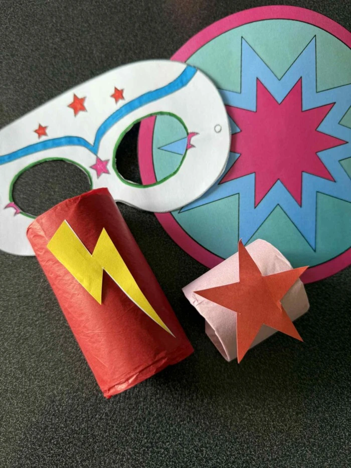 Kom och pyssla din alldeles egna superhjältedräkt. Skapa färgglada armband med blixtar och stjärnor, designa din egen mask och gör ett coolt emblem som visar dina superkrafter. Med sax, papper och fantasi förvandlar du dig själv till en riktig hjälte redo för äventyr!