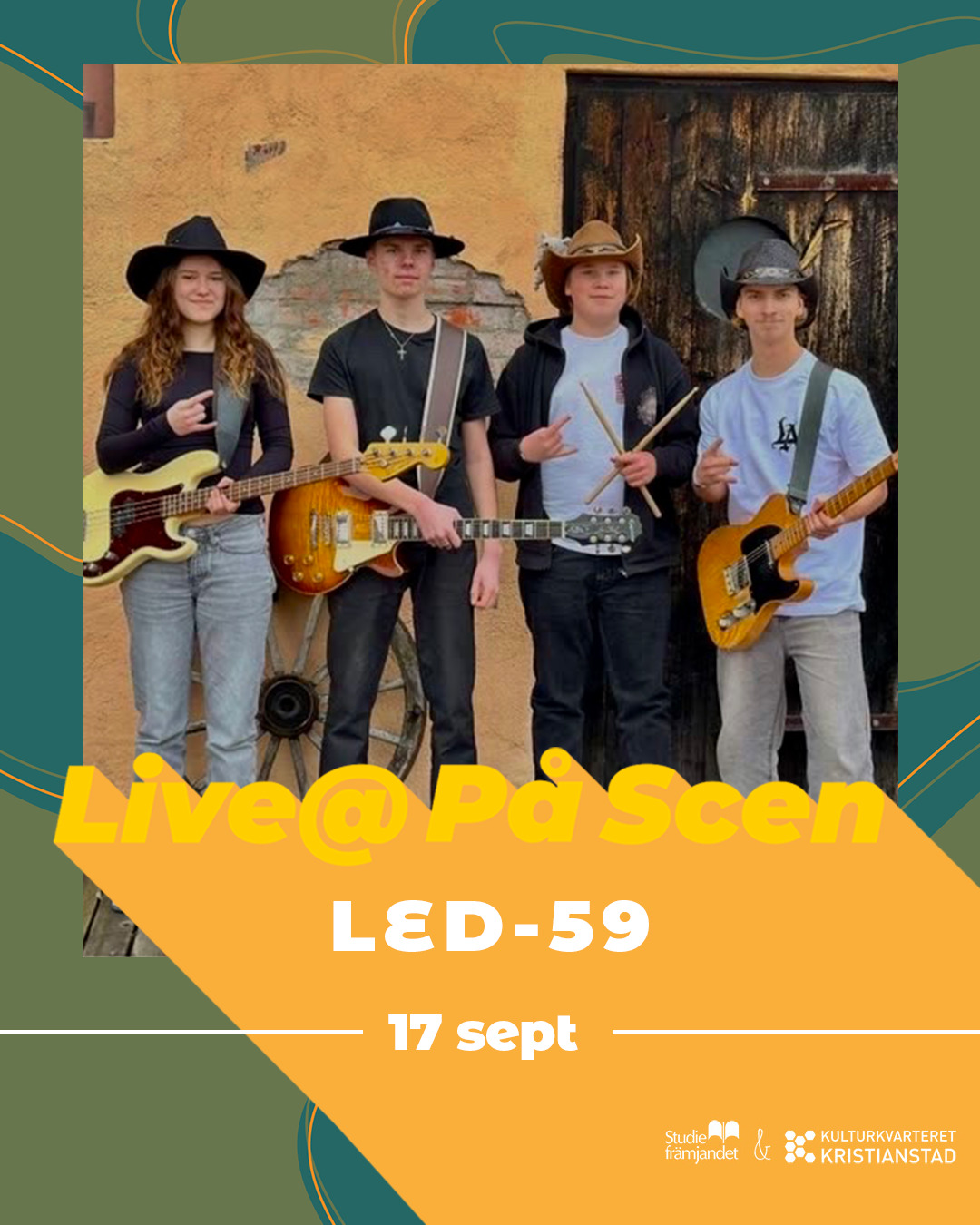 Live@ är ungdomsevenemang på Kulturkvarteret Kristianstad i samarbete med Studiefrämjandet i Skåne-Blekinge. Vi kommer att arrangera flera olika aktiviteter för ungdomar som konserter, workshops, prova på tillfällen och möjligheten för dig att stå på scen! Tillsammans skapar vi en plats för ungdomar med gemensamma intressen att träffas och utvecklas!